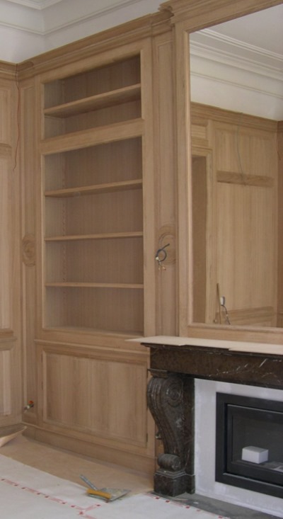 This picture I took a few weeks ago in our workshop. Oak cabinetry and paneling in progress.